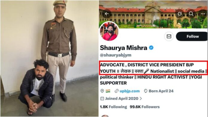 भाजपा युवा मोर्चा का जिला उपाध्यक्ष होने का दावा : वहीं आरोपी शौर्य मिश्रा ने अपने सोशल मीडिया प्लेटफॉर्म(X) अकाउंट पर खुद को भाजपा युवा मोर्चा का जिला उपाध्यक्ष होने का दावा कर रखा है. शौर्य मिश्रा के सोशल मीडिया प्लेटफॉर्म(X) अकाउंट पर करीब 1 लाख फॉलोअर्स हैं. गुरुग्राम पुलिस के पीआरओ संदीप ने बताया कि "पुलिस पूछताछ में आरोपी ने स्वीकार किया कि उसने सोशल मीडिया पर देखी गई एक आपत्तिजनक पोस्ट को उठाकर अपने अकाउंट से साझा किया था. पुलिस ने आरोपी के कब्जे से उसका मोबाइल भी बरामद कर लिया है. उसे कोर्ट में पेश किया जाएगा. फिलहाल पुलिस मामले की गहन जांच कर रही है."