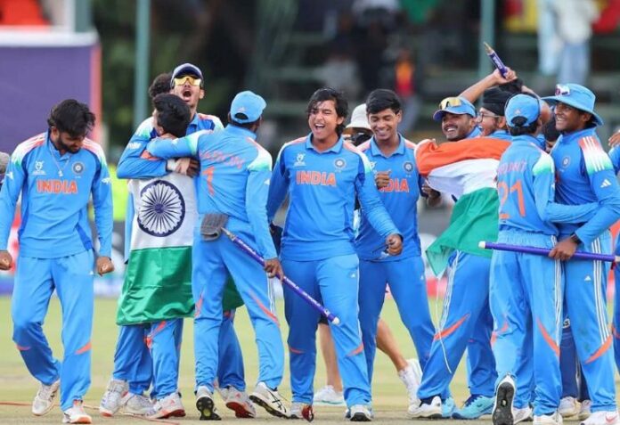 हरारे। आईसीसी मेन्स अंडर-19 विश्व कप 2026 के फाइनल में शुक्रवार (6 फरवरी) को भारतीय टीम का सामना इंग्लैंड से हुआ। हरारे के हरारे स्पोर्टस क्लब में हुए इस मुकाबले में टॉस भारतीय टीम ने 100 रनों से शानदार जीत हासिल की। वैभव सूर्यवंशी (175 रन) की तूफानी पारी की बदौलत भारत ने इंग्लैंड को 412 रनों का पहाड़ सा लक्ष्य दिया। टारगेट का पीछा करते हुए इंग्लैंड की टीम 40.2 ओवरों में 311 रनों पर सिमट गई। भारतीय टीम ने इसके साथ ही रिकॉर्ड छठी बार अंडर-19 वर्ल्ड कप जीत लिया।