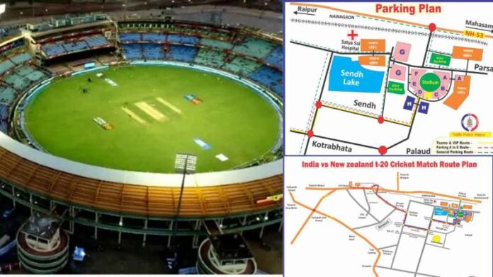 IND vs NZ Raipur : आज रायपुर के Shaheed Veer Narayan Singh International Cricket Stadium में भारत और न्यूजीलैंड के बीच टी-20 मुकाबला खेला जाएगा, जो शाम 7 बजे से शुरू होगा। मैच को लेकर प्रशासन ने कड़े सुरक्षा इंतजाम किए हैं और दर्शकों की सुविधा के लिए विस्तृत ट्रैफिक रूट प्लान भी जारी किया गया है।