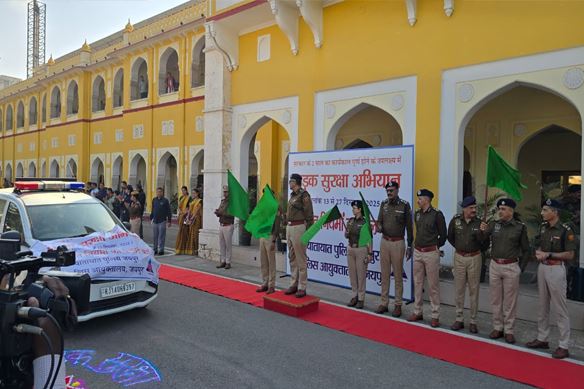 जयपुर । जयपुर पुलिस आयुक्त सचिन मित्तल ने सरकार के 2 वर्ष का कार्यकाल पूर्ण होने के उपलक्ष्य मे आयुक्तालय जयपुर मे 13 से 27 दिसम्बर तक दो सप्ताह का सडक़ सुरक्षा अभियान के तहत यातायात पुलिस और कालिका पेट्रोलिंग यूनिट द्वारा आमजन को यातायात नियमों के प्रति जागरूकता का संदेश देने शहर के प्रमुख मार्गो पर जन जागरूकता के लिए वाहन जागरूकता रैली को पुलिस आयुक्तालय परिसर से हरी झंडी दिखा कर रवाना किया।