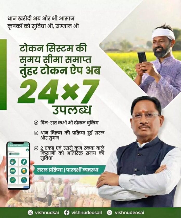 रायपुर : से किसानों के हित में एक बड़ी और राहत भरी खबर सामने आई है। मुख्यमंत्री विष्णुदेव साय ने आज सुबह सोशल मीडिया के माध्यम से जानकारी दी कि तुंहर टोकन ऐप अब पूरे 24 घंटे, यानी 24×7 उपलब्ध रहेगा। राज्य सरकार के इस फैसले से धान खरीदी की प्रक्रिया पहले से कहीं अधिक आसान और सुविधाजनक हो गई है।