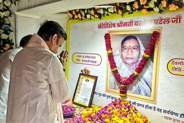 भोपाल : उप मुख्यमंत्री राजेन्द्र शुक्ल ने नरसिंहपुर जिले के गोटेगांव में पंचायत एवं ग्रामीण विकास और श्रम मंत्री प्रहलाद सिंह पटेल एवं पूर्व राज्य मंत्री जालम सिंह पटेल की माताजी स्वर्गीय यशोदा पटेल के निधन पर शोक संवेदना व्यक्त की। उन्होंने स्वर्गीय यशोदा पटेल के चित्र पर पुष्प अर्पित कर श्रद्धांजलि दी। उप मुख्यमंत्री शुक्ल ने ईश्वर से दिवंगत आत्मा की शांति और शोकाकुल परिवार को कठिन समय में संबल प्रदान करने की प्रार्थना की।