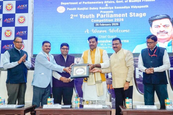 भोपाल। एलएनसीटी यूनिवर्सिटी में लोकतंत्र की जड़ों को मजबूत करने और युवा पीढ़ी को संसदीय कार्यप्रणाली से रूबरू कराने के उद्देश्य से स्कूल ऑफ लीगल स्ट्डीज एल एन सी टी युनिवर्सिटी में 'युवा संसद प्रतियोगिता' का भव्य आयोजन किया गया। इस कार्यक्रम में छात्रों ने न केवल सांसद और मंत्रियों की भूमिका निभाई, बल्कि ज्वलंत राष्ट्रीय मुद्दों पर प्रखर बहस भी की। कार्यक्रम के मुख्य अतिथि रामेश्वर शर्मा (विधायक, हुजूर, ) थे। कार्यक्रम का प्रारंभ दीप प्रज्वलन तथा सरस्वती वंदना से हुआ। कार्यक्रम के मुख्य अतिथि रामेश्वर शर्मा ने सभी को संबोधित करते हुए कहा कि लोकतंत्र इस देश का आधार है और युवा उस लोकतंत्र की आवाज हैं। यह कार्यक्रम प्रो. (डॉ.) मुकेश कुमार साहू (डीन एंड डायरेक्टर, स्कूल ऑफ लीगल स्ट्डीज, एल एन सी टी युनिवर्सिटी) की अध्यक्षता में किया गया। कार्यक्रम के दौरान जय नारायण चौकसे (चांसलर, एल एन सी टी युनिवर्सिटी) डॉ अनुपम चौकसे (ग्रुप सेक्रेटरी, एल एन सी टी), प्रो. (डॉ.) एन. के. थापक (वी .सी., एल एन सी टी युनिवर्सिटी), डॉ. अजीत सोनी (रजिस्ट्रार, एल एन सी टी युनिवर्सिटी), (डॉ) ए. के. सिंघई (डीन एकेडमिक, एल एन सी टी युनिवर्सिटी) एवं प्रो. (डॉ.) आर. के. चौरसिया (प्रिंसिपल, स्कूल ऑफ पैरामेडिकल, एल एन सी टी युनिवर्सिटी) उपस्थित रहे।