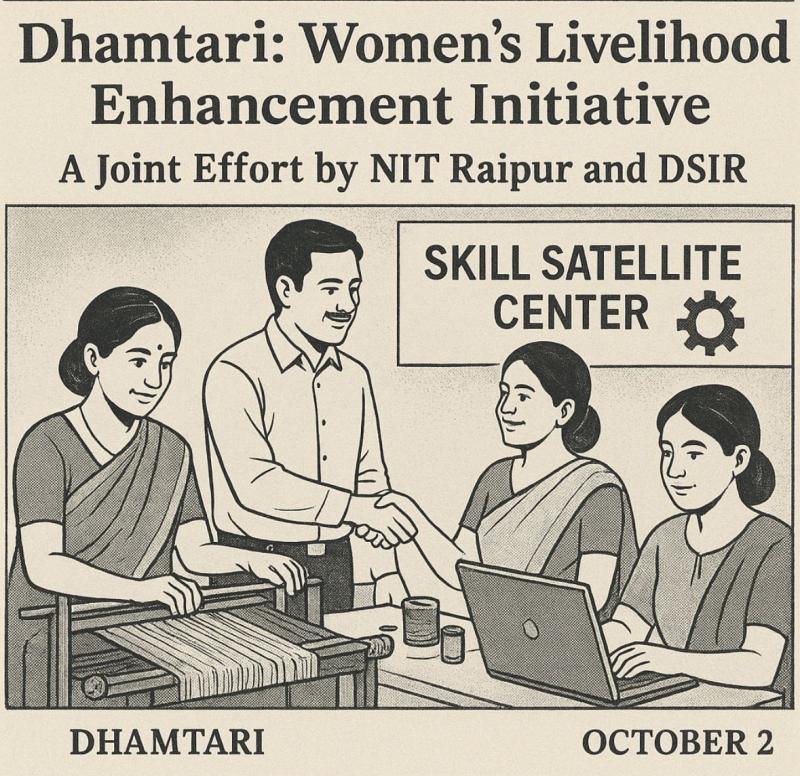 धमतरी : महिलाओं के कौशल विकास और आजीविका संवर्धन के लिए धमतरी में महिलाओं की आजीविका संवर्धन के लिए एन.आई.टी. रायपुर और डी.एस.आई.आर. की साझी पहल की है । डी.एस.आई.आर. का छत्तीसगढ़ ही नहीं बल्कि भारत में पहला प्रोजेक्ट है ।