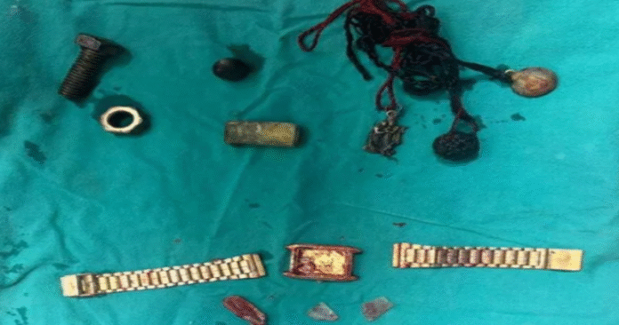 राजस्थान की राजधानी जयपुर के सवाई मानसिंह (एसएमएस) अस्पताल के सर्जरी विभाग में एक ऐसा मामला सामने आया जिसने डॉक्टरों को भी हैरान कर दिया. नागौर जिले के रहने वाले 34 साल के सुभाष नाम के युवक को पेट दर्द की शिकायत पर अस्पताल लाया गया था, लेकिन जांच में जो सामने आया, उसने सभी को चौंका दिया. युवक को अस्पताल में भर्ती कर 4 घंटे तक 8 सीनियर डॉक्टरों ने ऑपरेशन किया, जिसके बाद युवक के पेट से हाथ घड़ी और लोहे के कई टुकड़े निकले.